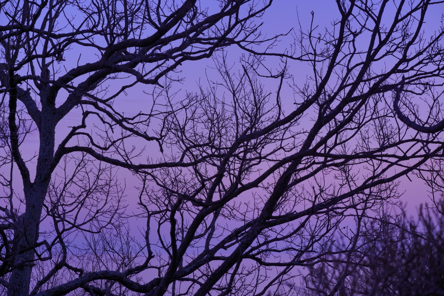 夕暮れ。グラデーションに染まる夕焼けの海を背景に木々を撮影。
