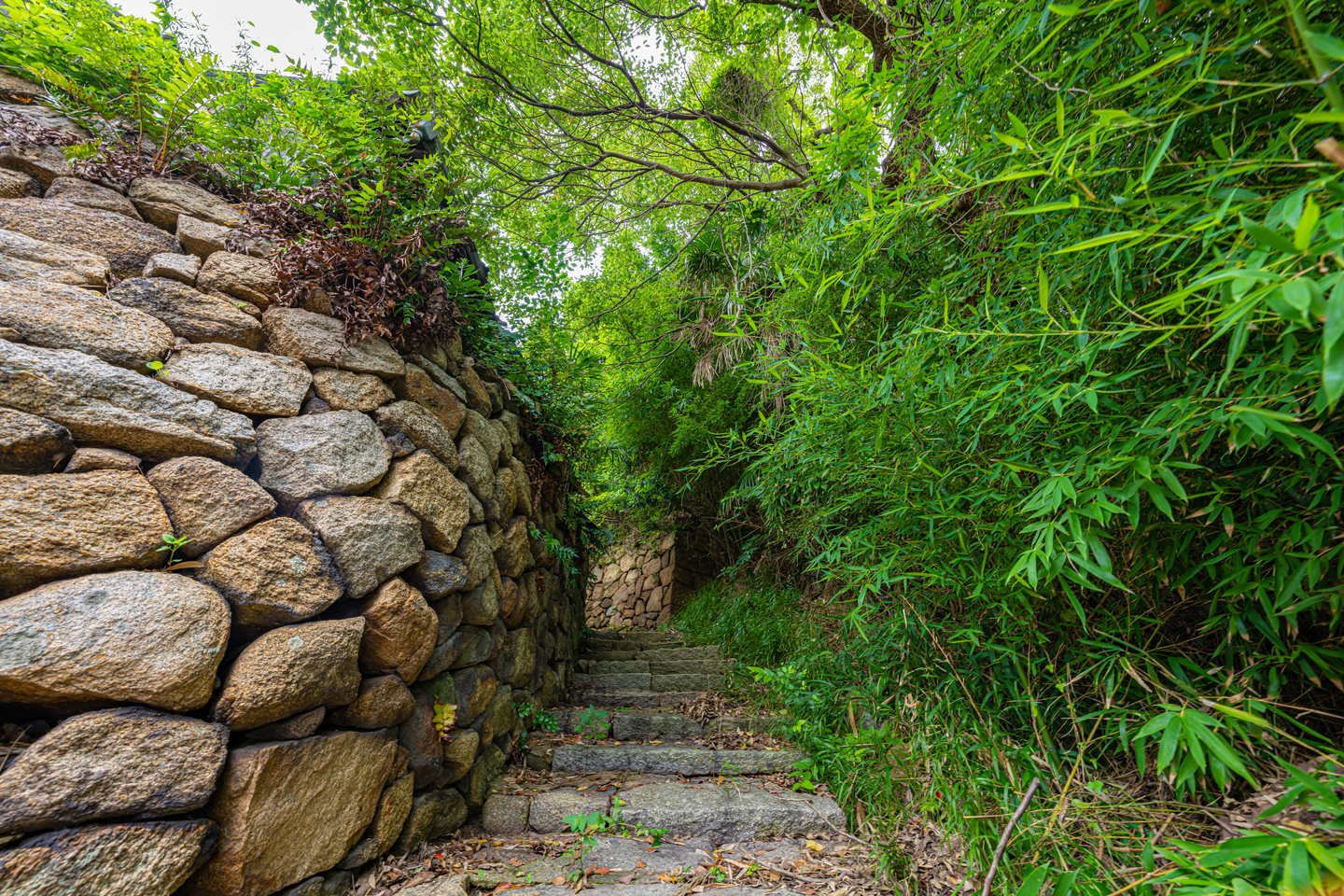 そこから少し歩くと、周りは高い壁と植物に覆われて全く海は見えなくなってしまう。見上げると橋は見えるので海に向かう方向は何となく解るが、迷路のような細く曲がりくねった坂道は人影も無く少し不安になる。それにしても魅力的な小径が無数にあり少し立ち寄っただけでは全然時間が足りない。上の写真の小道も凄く通りたかったのだが海とは反対に向かう道だったので、時間の無い私は涙を呑んで分かれ道での撮影だけに留めた。新緑の緑グラデーションと、石垣の質感が階段の小道の奥行ある立体感を伝えてくれるのは、流石GMレンズの表現力である。