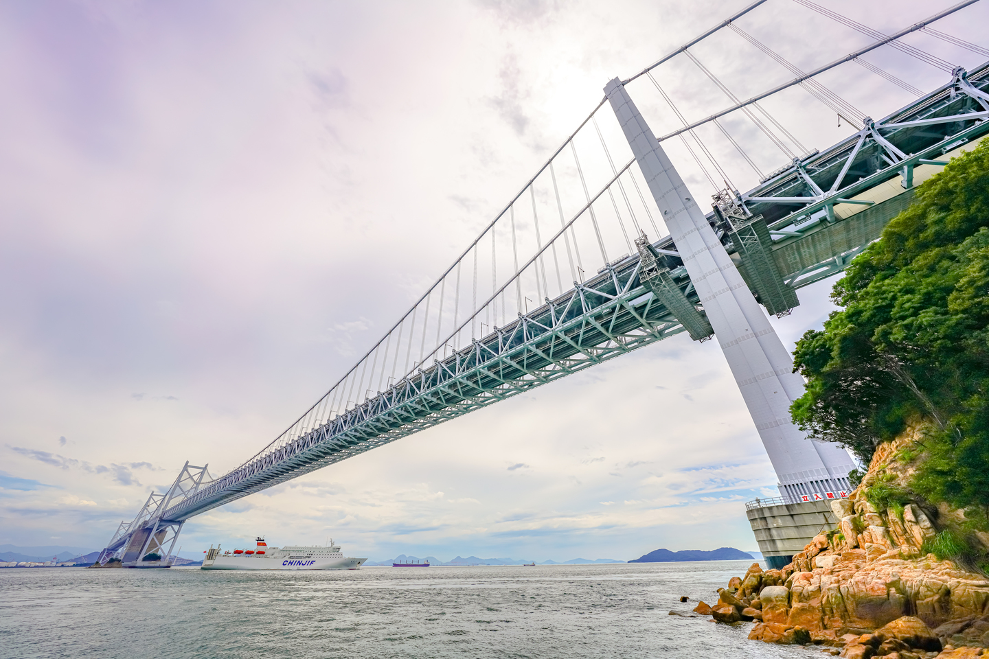 小道の誘惑を跳ね除けて海側に辿り着くと、そこは小さな港になっていた。港の岸壁から瀬戸大橋が伸びる方向をみると、向こう岸に四国が見える。短時間に大型船の往来が多くて瀬戸内海の海路の凄さを実感出来た。与島のこの場所から対岸まで約5KM程なのだが殆ど橋の袂から見上げた構図で入りきるのは12mmの超広角ならではだと思う。拡大すると橋の下を通る船の小さな文字まで読める解像感が素晴らしい。
