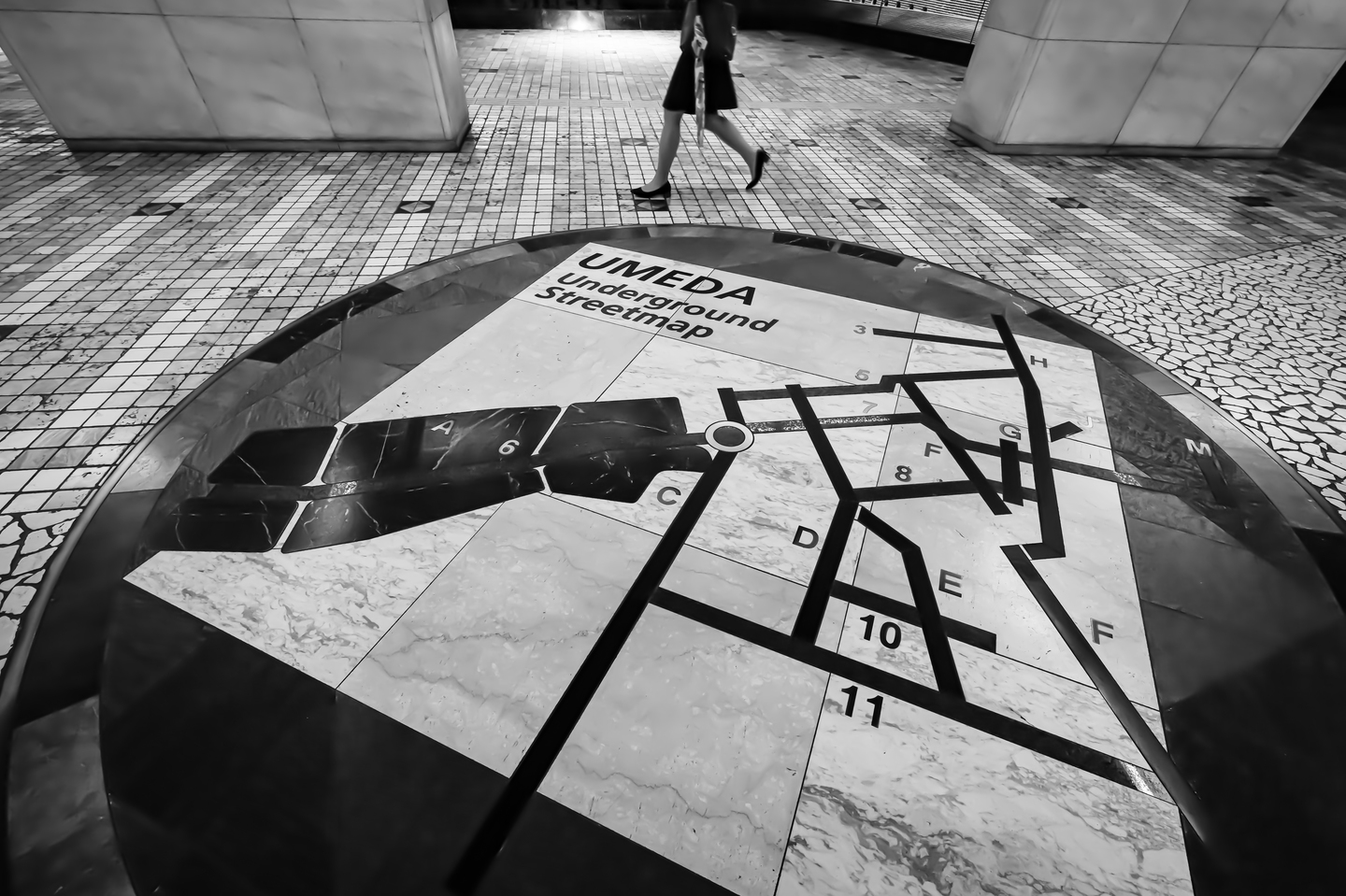 大阪駅の地下道で少し雰囲気を変えてB&W撮影(白黒撮影)。ミラーレス一眼なので当たり前ですがB&W設定にしてファインダーを覗くと白黒で見ることができるので、黒い部分の締まりやモノクロームの階調を確認して撮影でき、自分のイメージに近いB&W撮影が簡単に出来ます。特にGMシリーズのレンズは白から黒までグレーの階調を豊かに表現してくれるのでB&W撮影も楽しくなります。