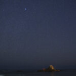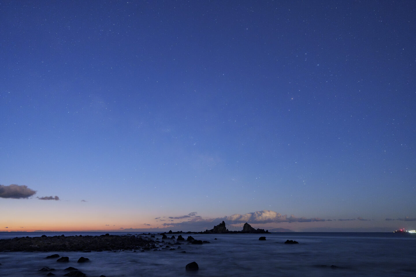 この写真は天の川撮影の定番スポット真鶴岬にて撮影したものになります。海に立つ奇岩が特徴的で、天の川との絡みも良く、天の川撮影の始まりはここで迎えることが多いです。この日はほぼ満月に近い月明かりがあり、残念ながら天の川はあまり濃く写りませんでしたが、薄明の美しい空と星たちの共演を存分に楽しむことができました。