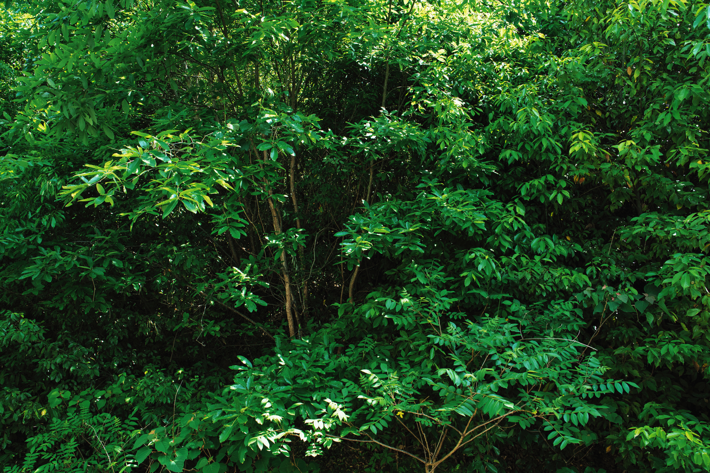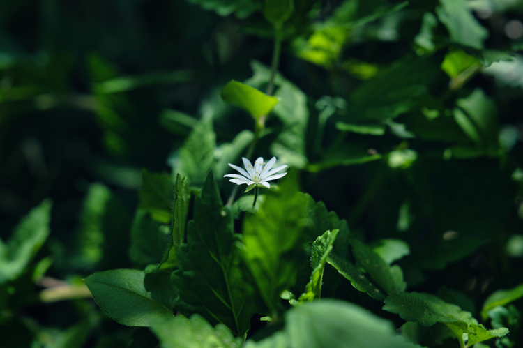葉が生い茂る足下に一輪の白い花が咲いていた。テレ端の最短距離はF8.0まで絞ってもピントはかなり浅い。白い花全体にピントを合わせておきたかったので開放ではなくF8.0まで絞っている。