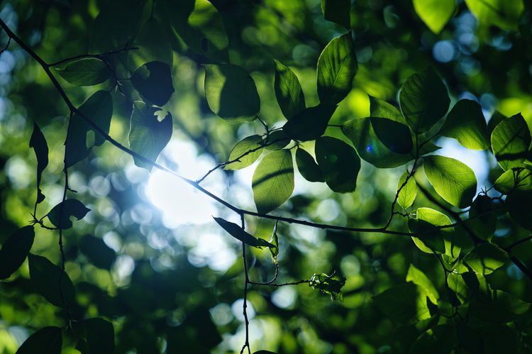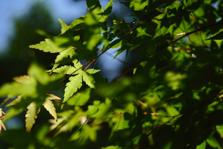 逆光で透ける葉をテレ端の開放で。背景の玉ボケが美しい。