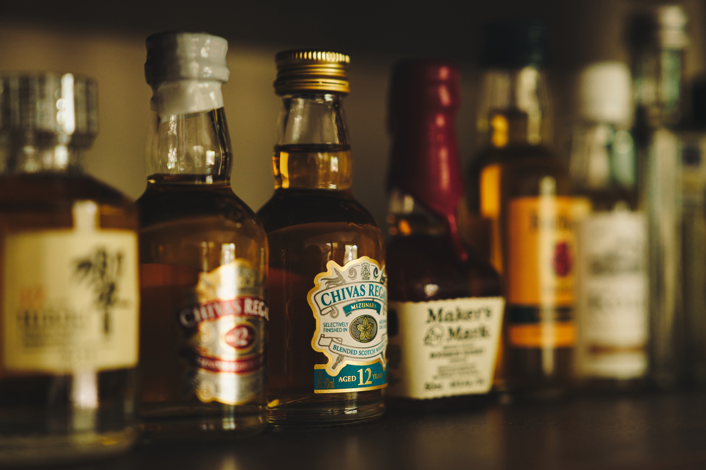趣味で集めているお酒のミニチュアボトル。前ボケも後ボケも滑らか。数あるボトルの中から特に自分が好きなラベルにピントを合わせた。