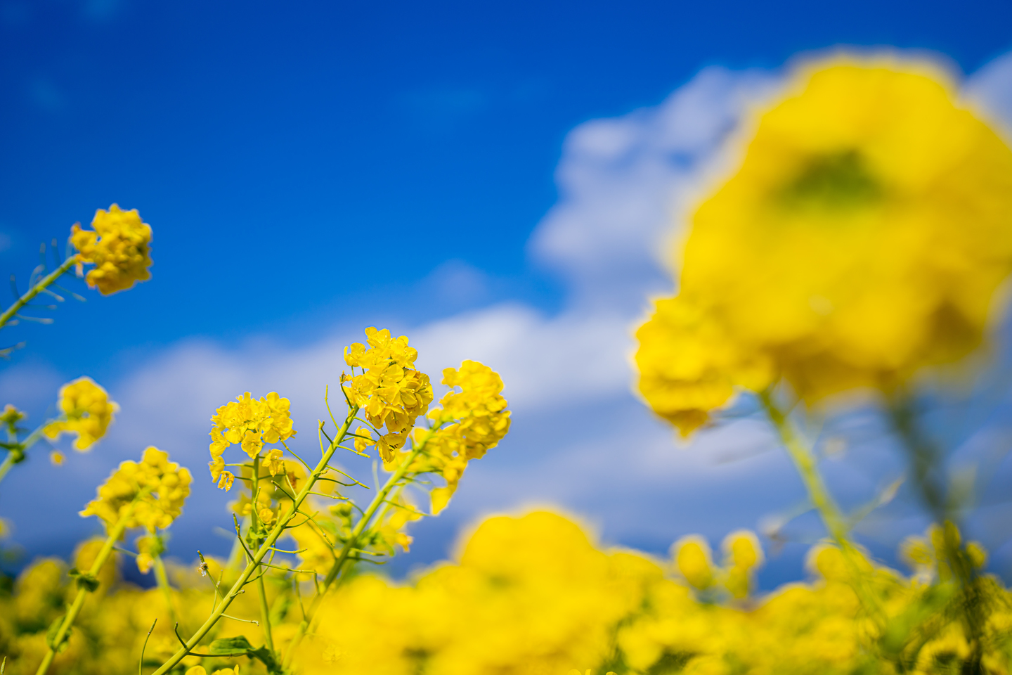もう少しボケを楽しみたくなったので、続けて開放F1.4で被写体に寄りながら構図に前ボケも入れて撮影してみると、想像通り前ボケも柔らかくて優しい雰囲気になりました。風が強かったのでトラッキングAFを使用しての撮影です。勿論ボディ性能も大きな要因なのですが、レンズのAFスピードが速くて正確なので、トラッキングAFを使用する事により風に揺れる花を合掌し続けてくれ、シャッタースピード1/8000で揺れる菜の花も簡単にクッキリと止まってくれました。定番だけど菜の花には青い空が良く似合う。