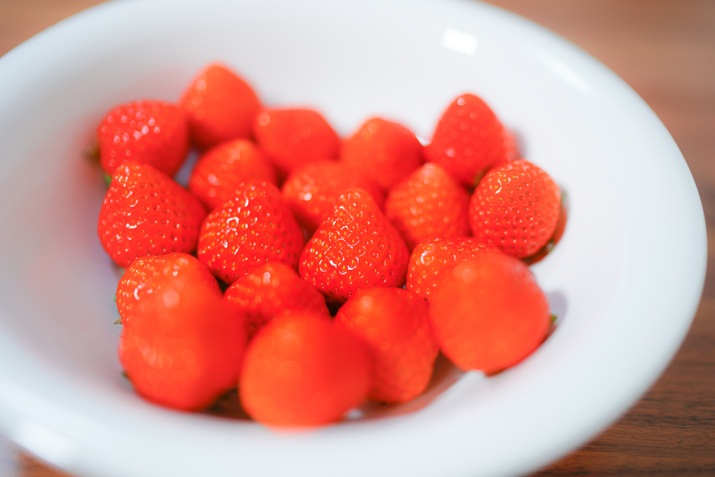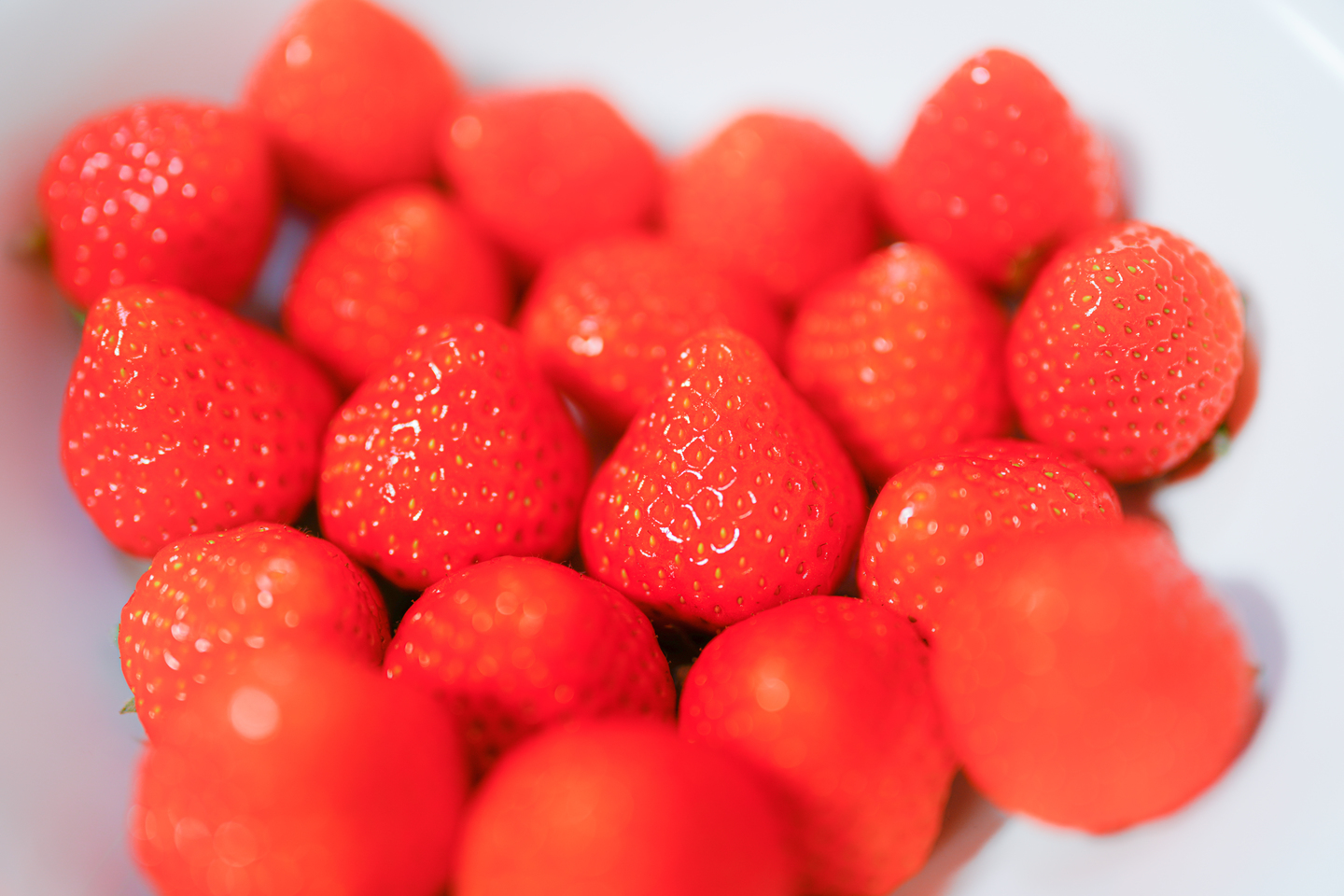 それに対してGMは物凄く寄れます。実際にイチゴを盛ったお皿を最短撮影距離で撮り比べて見ましたが1枚目がGM、2枚目がZEISSになります。一目瞭然ですがGMの方が圧倒的に寄れるという事が解ります。この2枚の撮影時の絞りはどちらも開放F1.4なので、解像感も比べて戴くと違いが解ると思います。