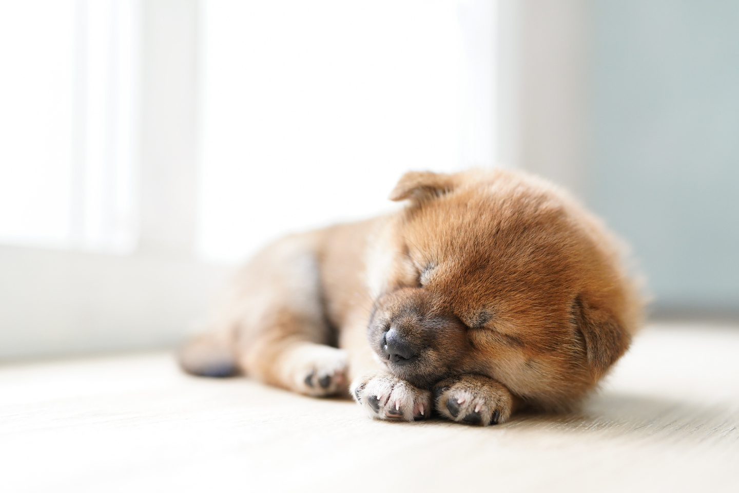 子犬を片手でなでなでしながら撮影していたら寝てしまいました。でも寝初めはちょっとした物音ですぐに起きてしまうので、なでなでしながらその手を一瞬離して撮影。またなでなでをしてと繰り返します。優しい光が差し込む部屋で撮影したので、ポカポカあたたかくて気持ちがよかったのですね。