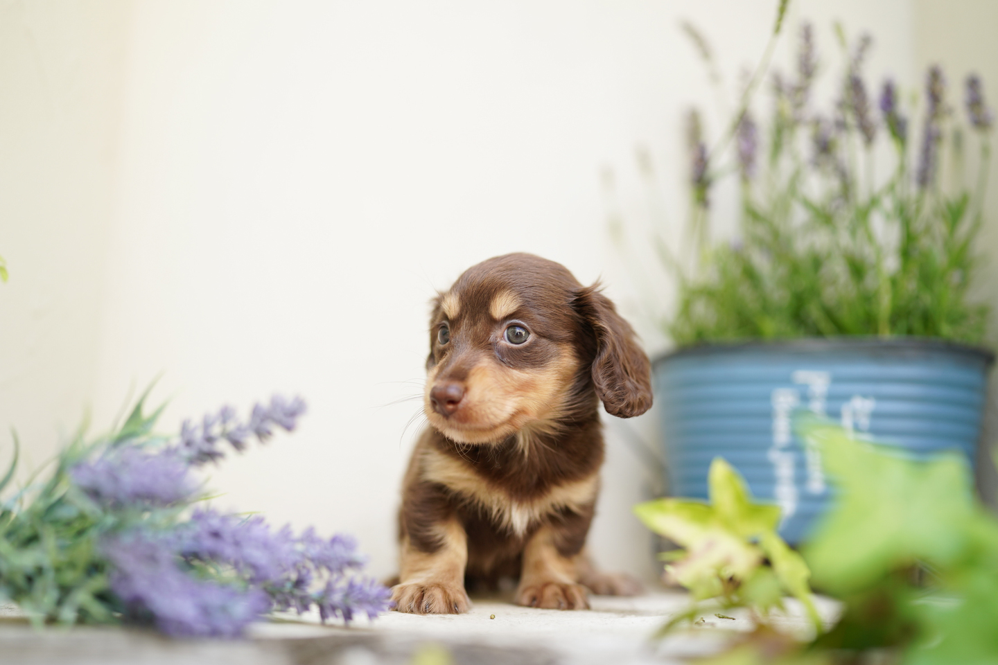 こちらはお庭の一角で撮影。後ろにはブリキポットに入ったラベンダーを配置し、手前にもラベンダーとグリーンを前ボケ用に配置、これらの間にわんこを配置して撮影しました。とても狭いスペースの中で撮影したため、ほとんどの物が主役のわんこのすぐ近くにある状態でしたが、これだけボケてくれるので絵にメリハリが出ました。