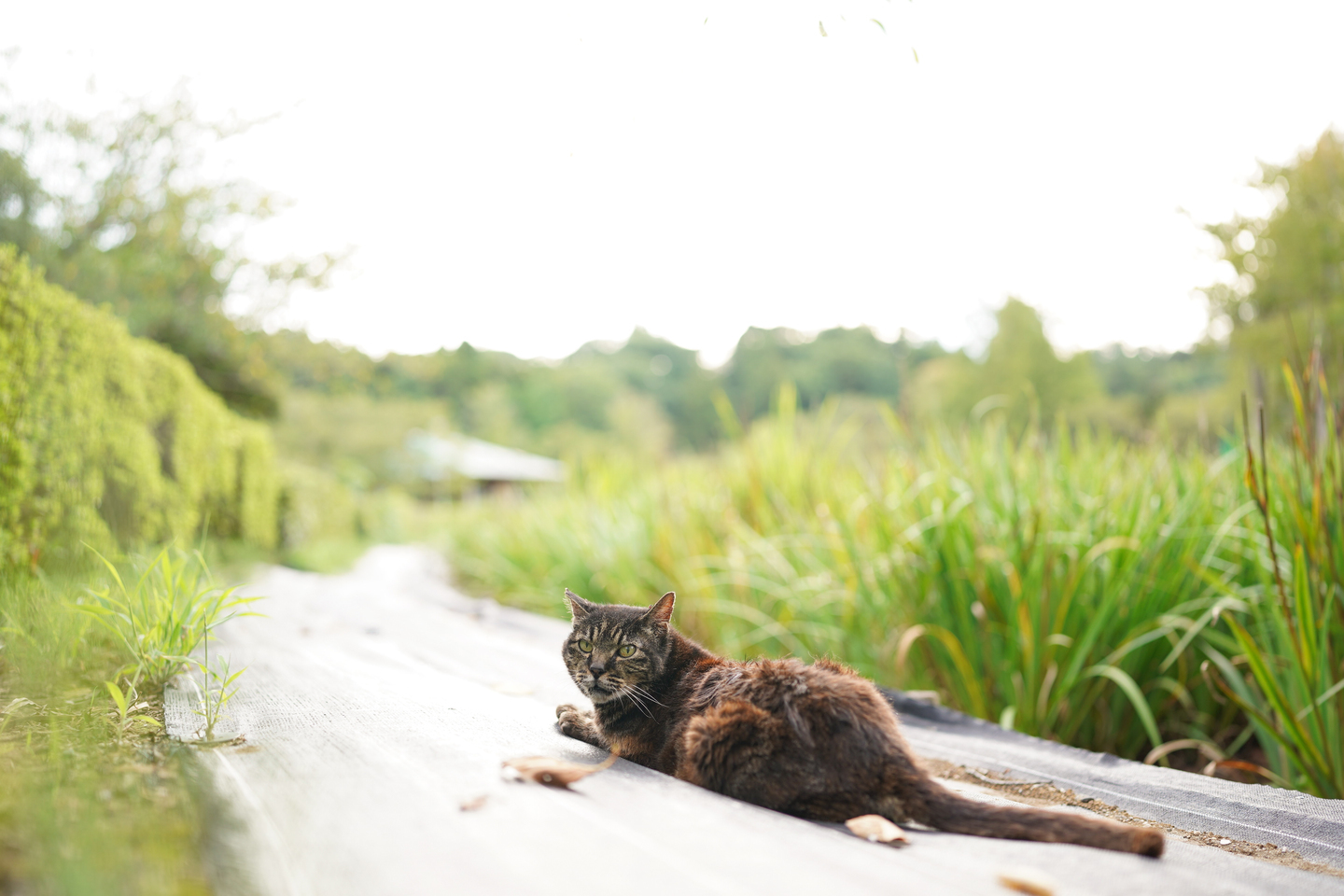 カメラを地面ギリギリの低い位置で構え、ぐっと近寄って撮影。広い景色を入れ込む事で、のどかな景気の中でくつろぐ様子を表現出来ました。田舎な感じの風景が野良猫らしさを演出しています。
