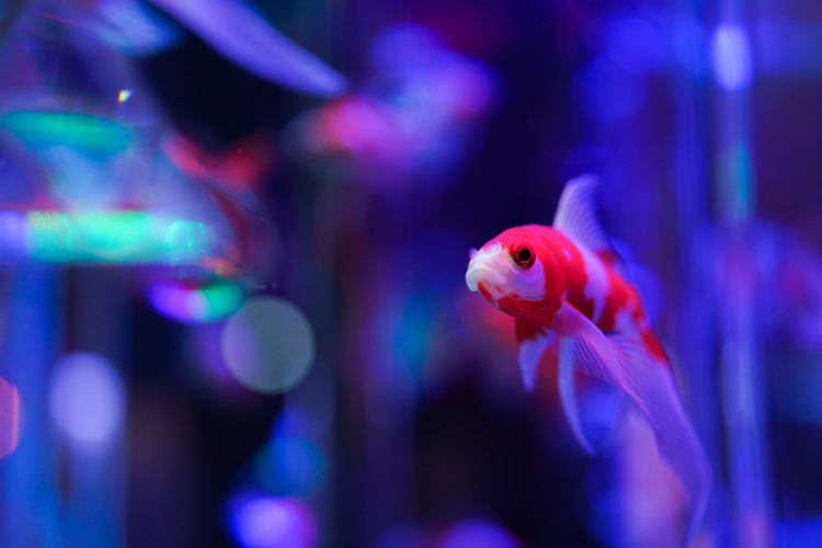 かなり暗い水槽の中で様々な色でライトアップされていました。背景の光源が美しい玉ボケとなって写っていますね。ふんわりとぼかす事で幻想的な雰囲気に仕上がります。