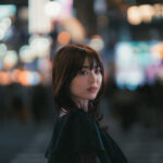 こちらも夜景ポートレートの一例で、先程よりやや近寄って撮影したものです。カラフルな看板や街の光が背景いっぱいに広がっていますが、開放F2ならではの大きなボケにより色とりどりの光が溶け合い、まるで抽象画のように背景が描かれています。被写体との距離を詰め76mmで撮影することで人物の存在感がさらに強調され、背景の光は大きなボケとして柔らかい後景を形成しています。にもかかわらず、モデルの目元や髪の描写は非常に精細で、暗所でもAFが迷うことなく確実にピントを合わせているのが分かります。暗所での合焦性能の高さと大口径による表現力で、夜のポートレートにも新たな可能性を感じさせる作例です。