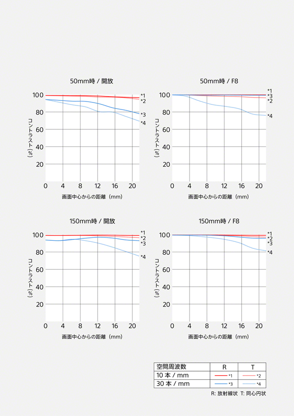 150mm開放時でも中心部から周辺まで高いMTF値を維持しており、ズームレンズとしては驚異的な描写性能です。放射方向(実線)と同心円方向(破線)との差が少なく、非点収差や軸上色収差が効果的に抑制されていることを示しています。F8に絞った場合には全域のシャープネスがさらに向上し、ポートレート撮影でも安心して使える性能が確認できます。