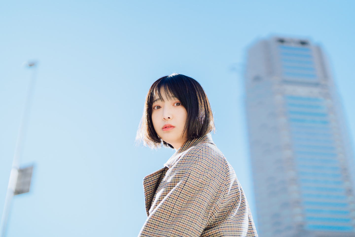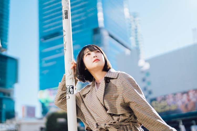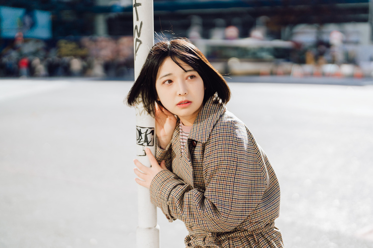 また、同じ場所で下から煽るように撮影しても背景に映るビルなども綺麗にぼかしてくれるので立体感を得ることができますし、看板のような情報が多い物体も、目立たなくさせてくれるので、モデルさんにしっかり目がいくと思います。やはり「F1.2」の立体感はすごいなと、撮影後に改めて写真を見返したときに痛感しました。