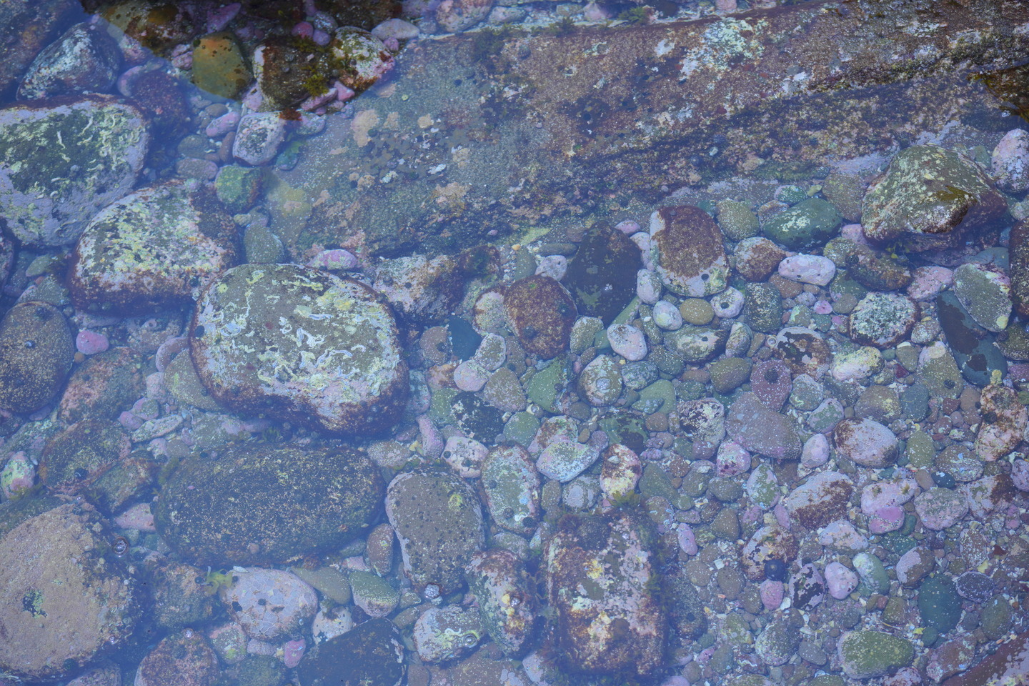 海水は透明。中を覗くと、いろいろな貝や虫がコソコソっと移動していった。