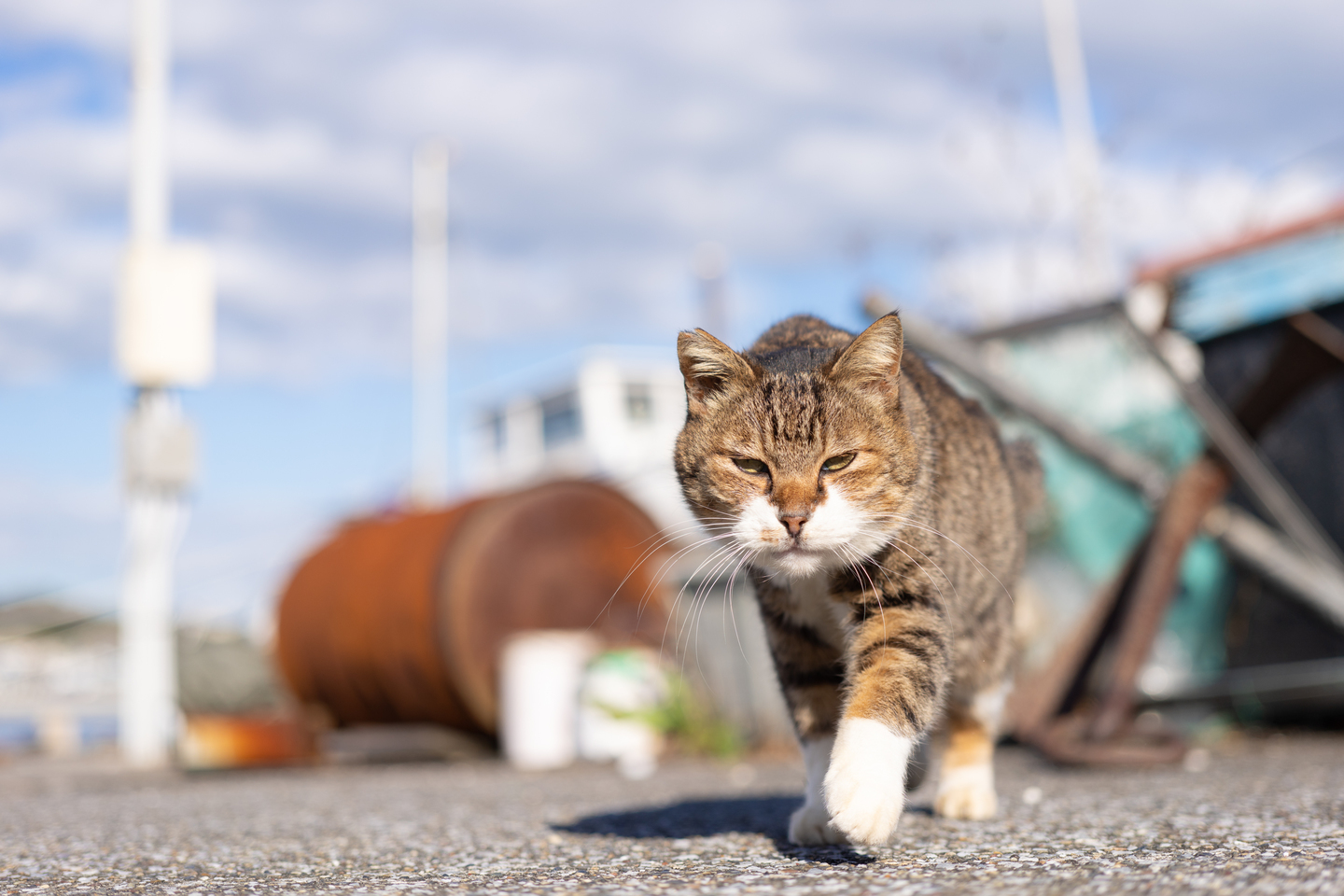 「港に猫」という最高のシチュエーションで撮った1枚。情景が伝わるように空間多めの猫小さめに撮影していますが、背後に広がる町や空がちょうど良い感じでボケてくれて私好みの仕上がり。このボケ感のちょうどよさが心地良いんです。