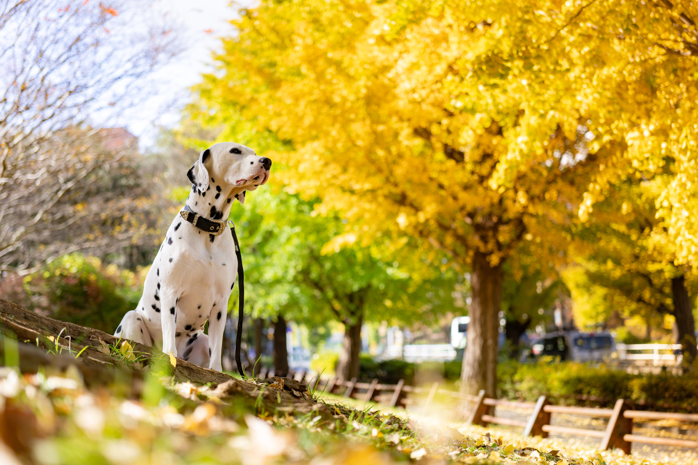 落ち葉の前ボケを入れて撮影。イチョウの黄色の発色が美しいです