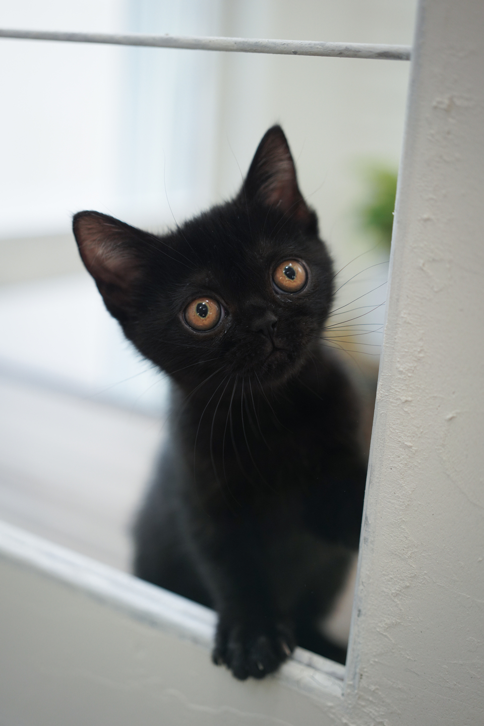 次はお家での写真。ふとした瞬間を撮った1枚。このレンズの最短撮影距離は35cmなので近距離での撮影が可能です。顔にぐっと寄って撮ってみましたがボケ味がナチュラルで美しい眼が際立っています。
