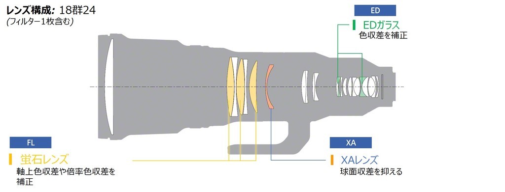 レンズ構成図を見てみるとFL(蛍石)レンズとXAレンズが中央に、ED(特殊低分散)レンズを後方に配置しています。