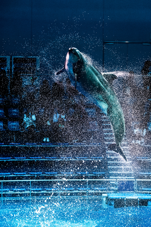 室内での撮影ではF2.8の明るさが武器になる。動きの速い被写体を確実に止めて撮るためISO感度を上げて撮影することになるが、それもやはり限界がある。そんな時に1段でも2段でも速いシャッター速度を切れるF値の明るいレンズが有効になります。下の写真は水族館でのイルカショーで、ジャンプしたイルカを止めて水飛沫を演出するにはシャッター速度1/1000秒は欲しいところ。ISO感度を6400まで上げて、絞りF2.8開放でギリギリのシャッターの速度で見事にイルカの動きを捉えることができました。