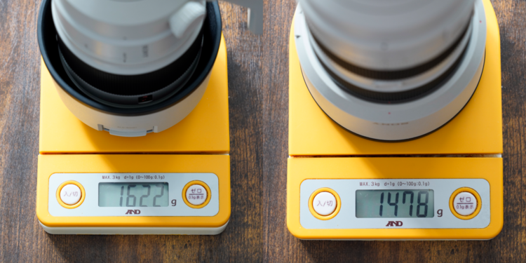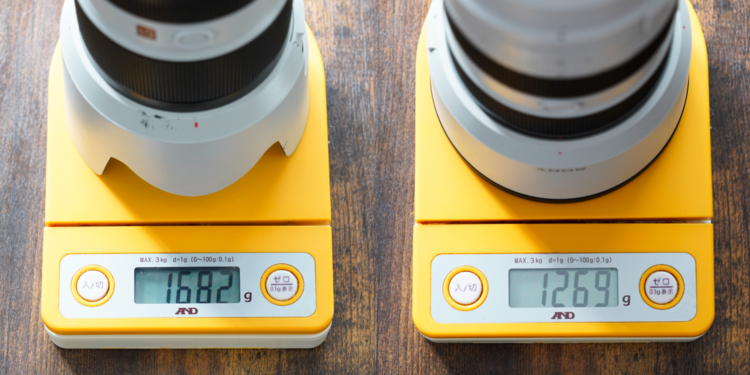 実際にレンズキャップ(フロント・リア)、レンズフード、三脚座を付けた状態で重量を計ってみました。I型は約1682g、II型は約1269gで約25%の軽量化になっています。付属品を付けない状態よりも軽量化率が減っているのは、レンズフードの形状変更によるものです。