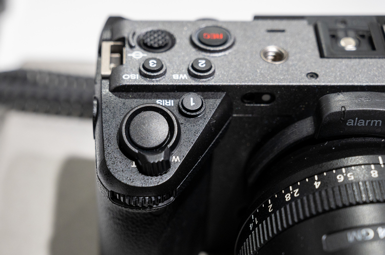 上面はフラットですっきりしたデザインになっており、一眼ミラーレスにあるような撮影モードダイヤルや露出補正などのダイヤルは無くなり、動画撮影に適したボタンやレバーが右側にレイアウトされています。右上に(1)IRIS「絞り」、(2)WB「ホワイトバランス」、(3)ISOが初期設定されたカスタムボタンが配置されており、その手前には大きなRECボタンがあります。