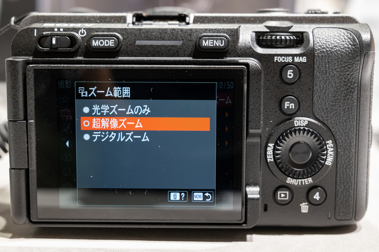 電源ボタンがあったところにはズームレバーが配置されており、対応する電動ズームレンズの「光学ズーム」の操作はもちろん、単焦点レンズ装着時にも画質劣化の少ない画像処理による「超解像ズーム」や「デジタルズーム」も行えます。