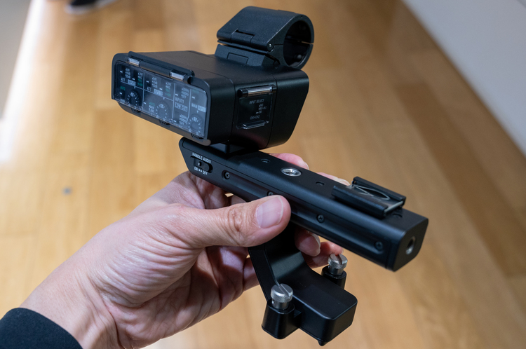 同梱のXLRハンドルユニットにはXLR端子を2基備えたデジタルオーディオインターフェース対応XLRアダプターを搭載しています。別売のXLRマイクとの組み合わせでデジタル信号をカメラに伝送できます。本体側の設定により、デジタル4CHや24bitでの音声収録もサポート。またXLRハンドルユニットにもネジ穴が3つ(上面2、後ろ1)ありますので、更なる拡張が可能です。