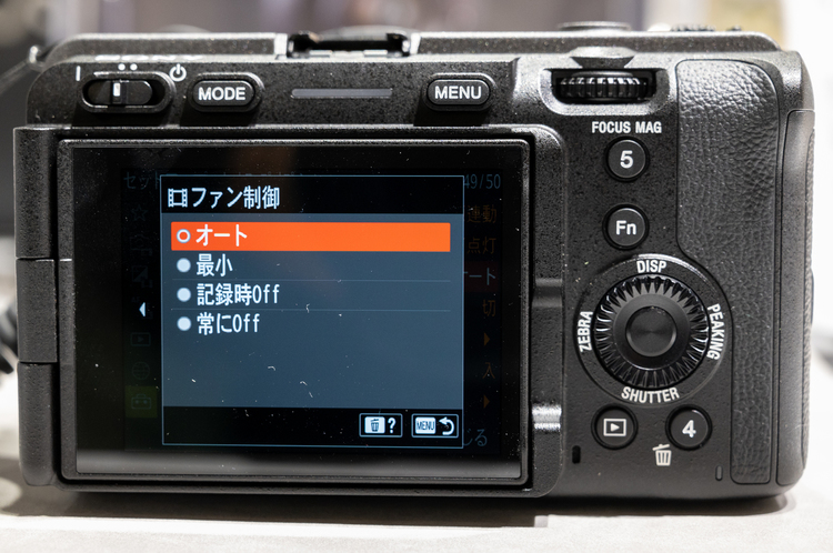 α7S IIIでも優れた放熱構造により、4K/120Pで60分間の連続撮影を可能にしていましたが、FX3ではその放熱構造に加え、冷却ファンを搭載する事で4K/120Pで最長13時間の連続撮影を可能にしています。冷却ファンの動作モードは撮影条件に合わせて、「オート」、「最小」、「記録時Off」、「常にOff」から選択を行え、音に拘るクリエイターの方でも安心して撮影することが出来ます。ショールームでは実際に「オート」と「最小」で冷却ファンを動作させてみたのですが、周りが騒がしいせいか、まだセンサーに熱を持っていなかったせいか、カメラに耳をあててもファンの音を聞き取る事ができませんでした。ひょっとしたらすごく微細な音なのかもしれない?とも思いましたが、ここは後日レビューでしっかり確認してみたいと思います。