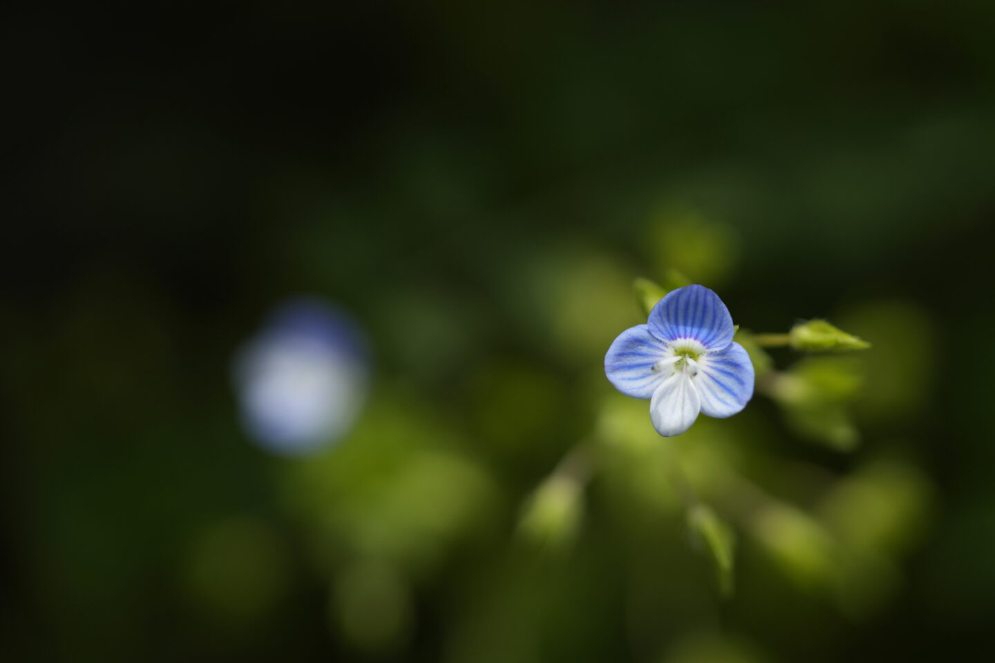 マクロレンズではクローズアップするほど被写界深度が浅くなり、撮影倍率が等倍のときには被写界深度が1mmと非常に浅くなります。オオイヌノフグリのような、花は小さいけれど花芯がニョキっと伸びていて花びらと花芯に距離のある花を正面から狙うと、花芯にピントを合わせると花びらがぼけてしまい、次に花びらにピントを合わせたら花芯がぼけてしまうことになり、いったいどちらに合わせていいか迷ってしまいます。絞り込んで被写界深度を深くしようとしても数mm程度の被写界深度しか得られず、花芯と花びらの両方にピントを合わせるのは難しいのです。
