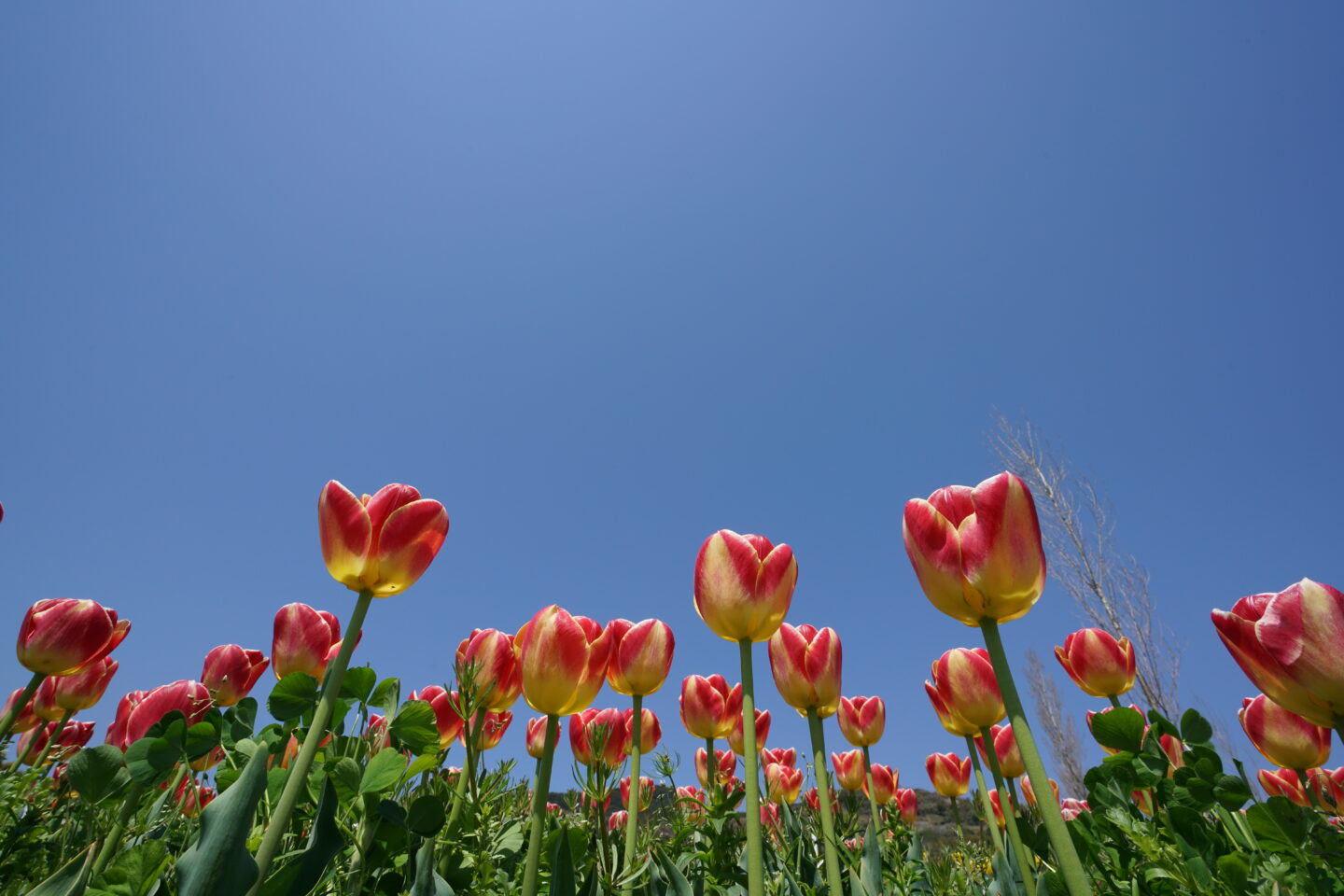 20cmくらいの高さの花でも超広角レンズで地面すれすれからレンズを向けると、広角レンズ特有の遠近感でとても背の高いチューリップに見えてきます。高層ビルを見上げたときと同じで、根元に寄ることで低い茎を太く、高い茎ほど細く見せるのがポイントです。そのために地面すれすれからローアングルで見上げるのが必須なんですね。また、チューリップの並びも重要で同じ高さ、同じ幅で植えられているとキレイなラインができるのでバランスが良くなります。