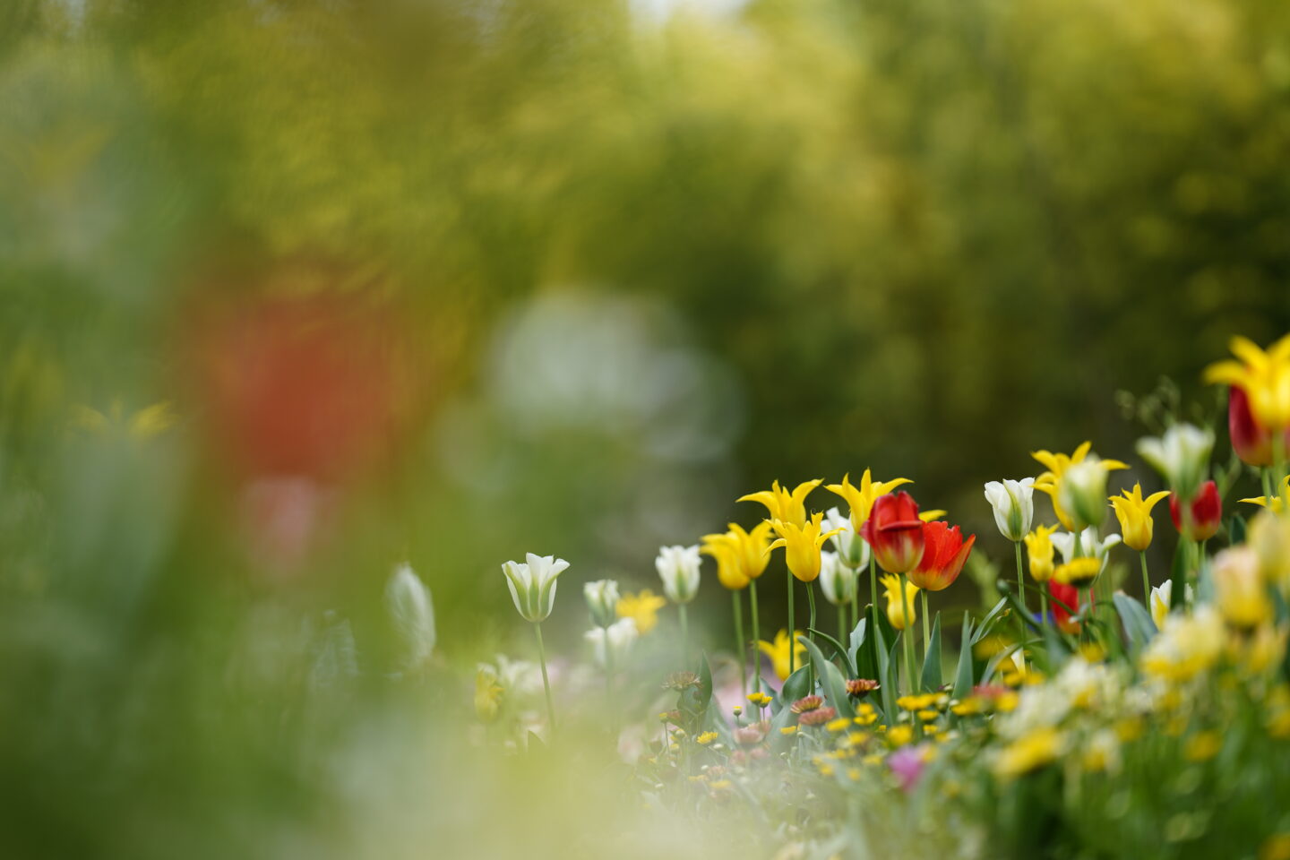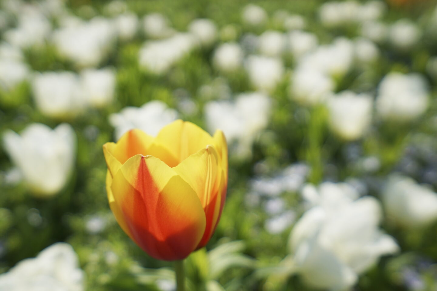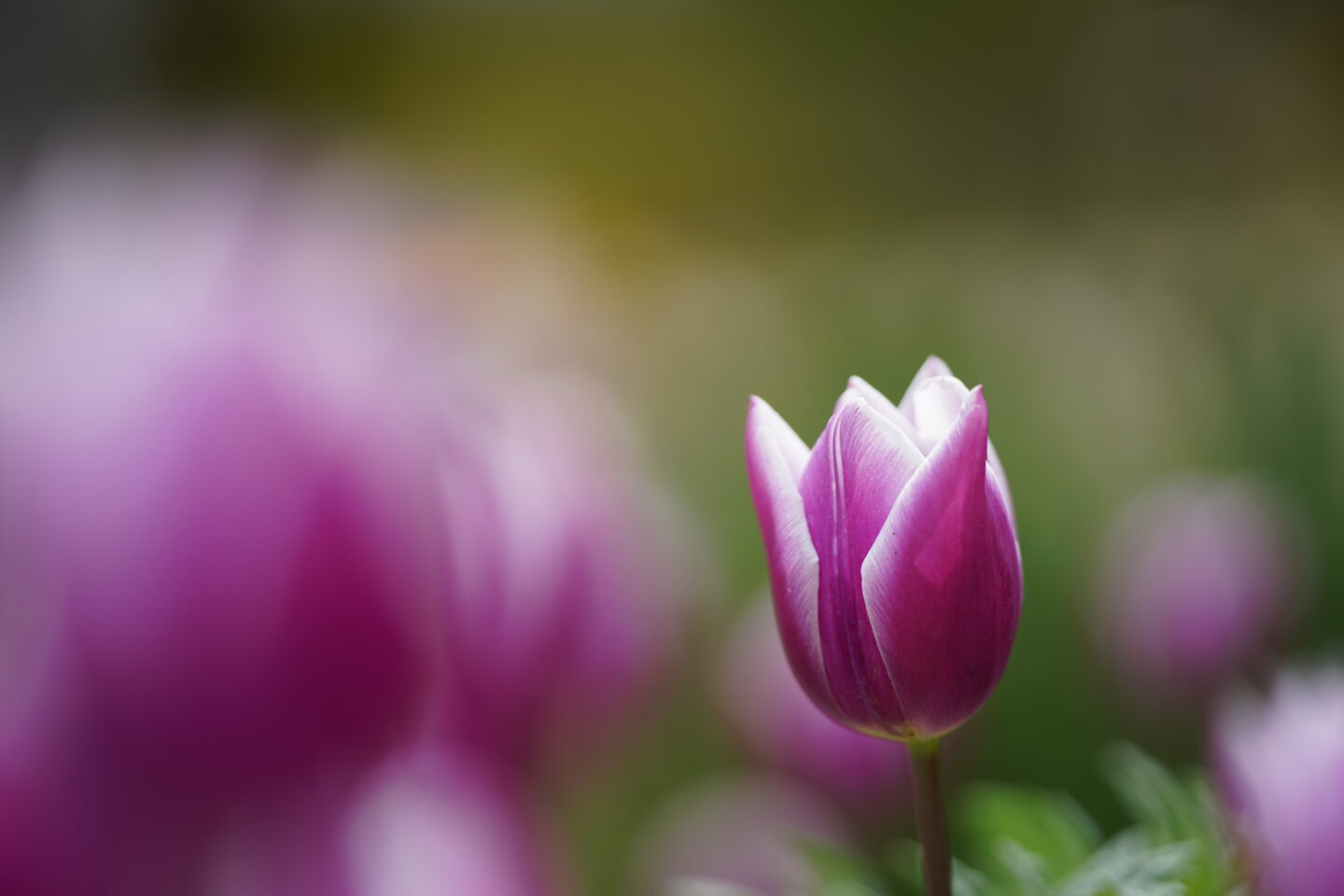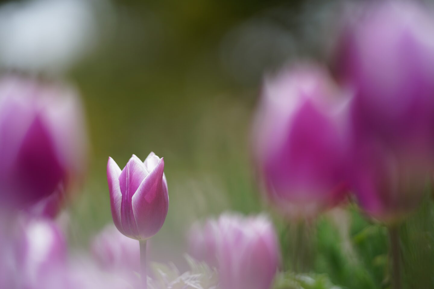 横並びに他の被写体があればピントが合ってしまいますし、前後に離れていても近ければ中途半端なボケになってしまいます。チューリップを小さくフレーミングしてもひとつだけにピントを合わせたいなら、密集してたくさん咲いているところよりもまばらに咲いているところを探さないと実現できません。