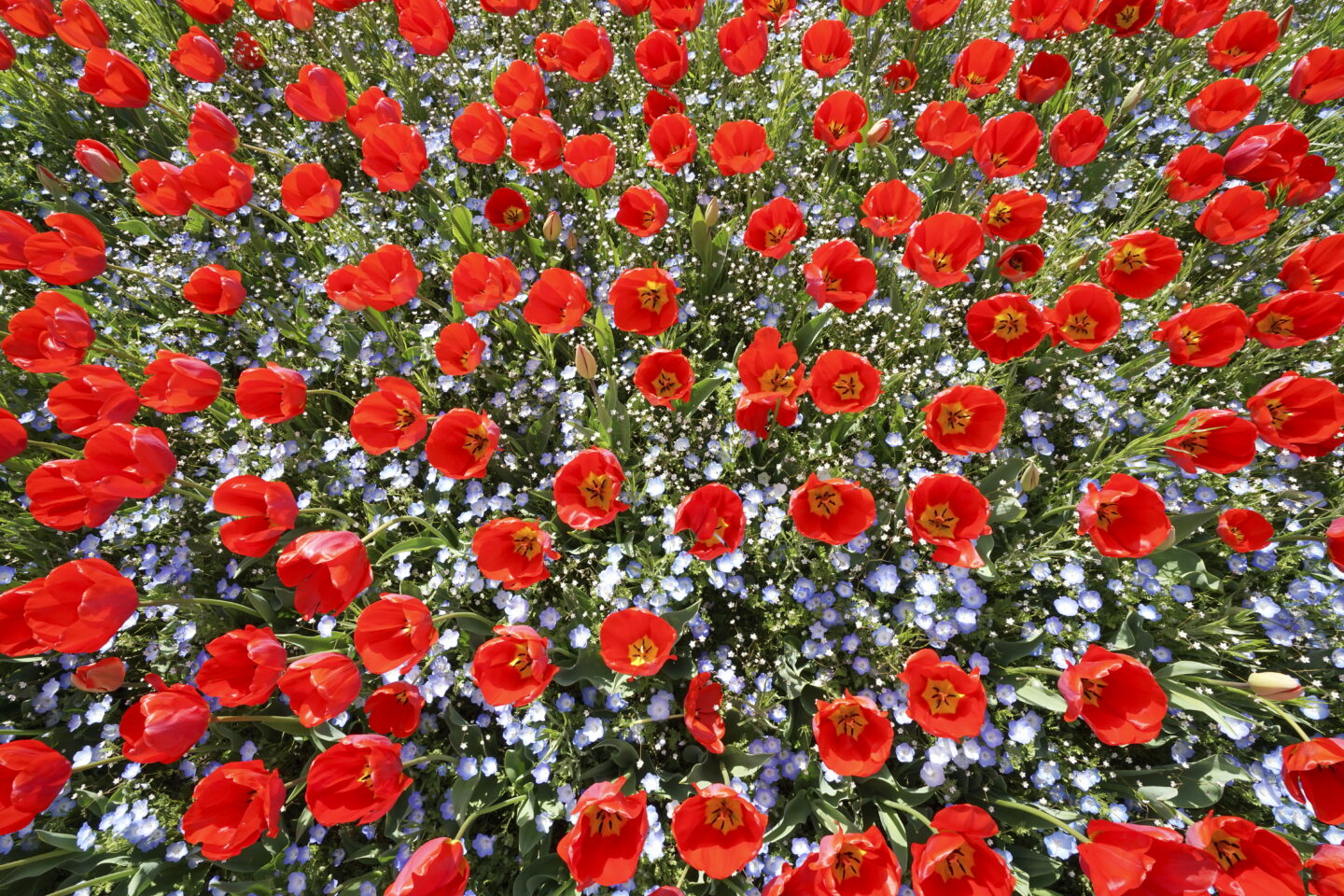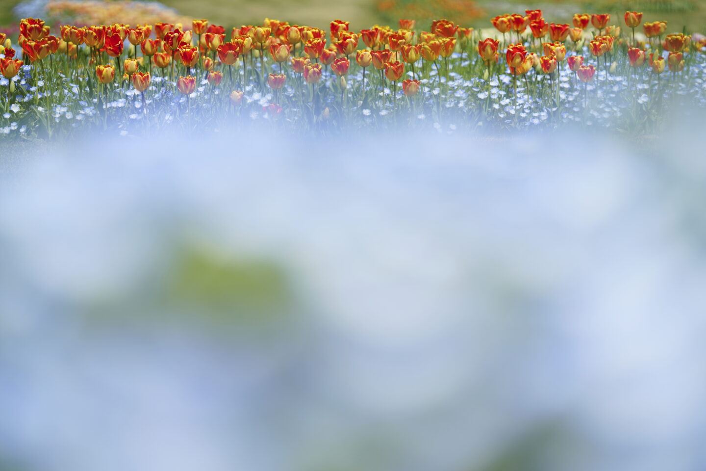 前ボケはネモフィラで奥のチューリップまでの距離は約10mくらいです。たくさん咲いている雰囲気を出したかったので遠くのチューリップの群生にピントを合わせています。一直線に咲くチューリップ全部にピントが合うよう、並んでいるチューリップに対して直角にレンズを向けました。チューリップを大きくすると数が少なく見え、ごちゃごちゃした雰囲気になってしまうので小さくたくさん入れるのがポイントです。また、両端はチューリップを途中で切るようにすると、どこまで咲いているかがわからなくなるのでたくさん咲いている雰囲気が増しますよ。