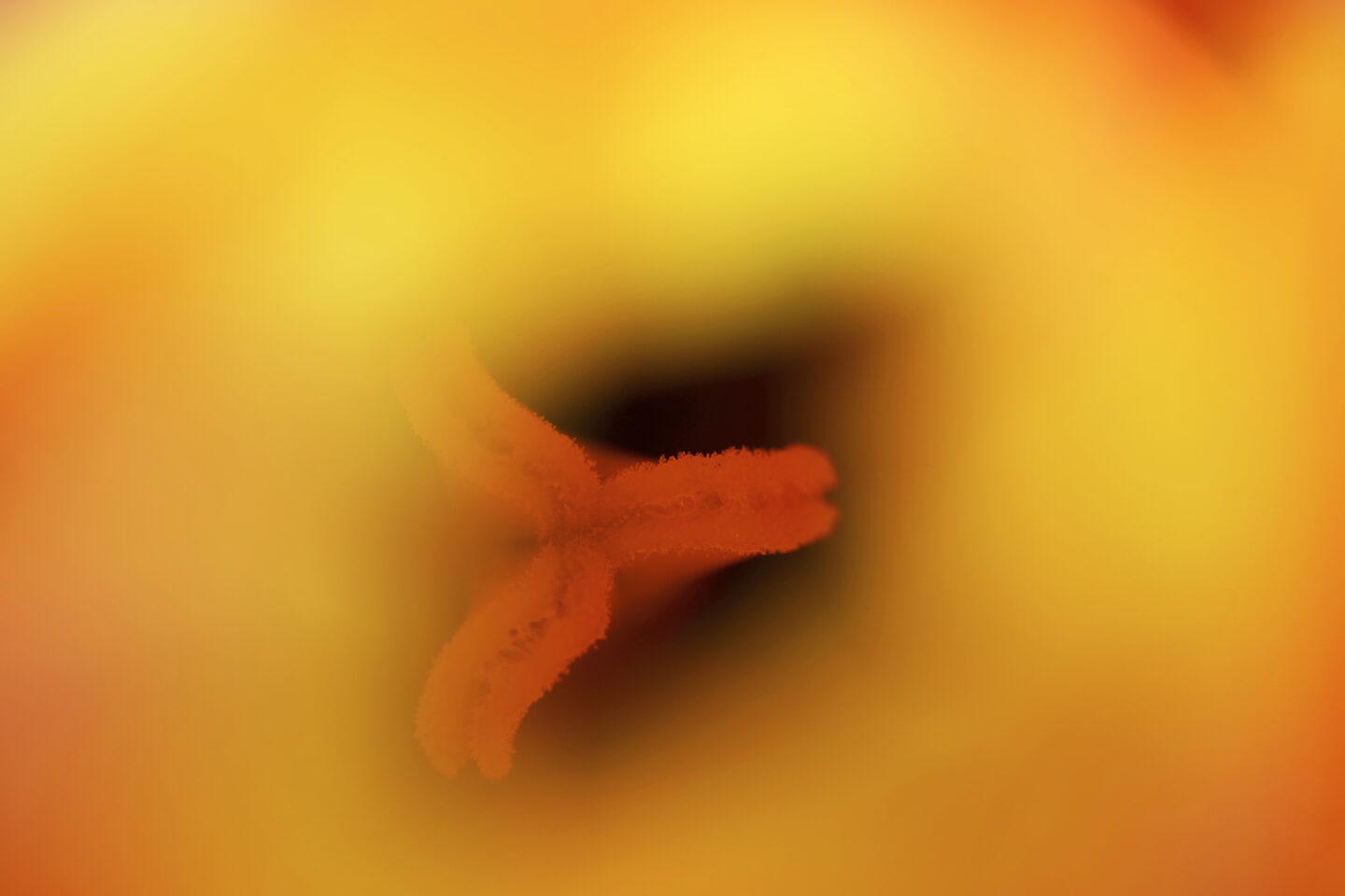 開き始めたばかりの1cmもない花びらの隙間から見える花芯です。花の輪郭が見えてしまうと花芯と同じくらい花の大きさを意識してしまうので輪郭が見えないよう一番大きな倍率で撮影しています。このときMFにしてピントリングを回して最短撮影距離に設定し、身体の前後移動でピント合わせをしています。撮影倍率が高くなるほどピントの合う範囲が浅くなるのでピント合わせはとてもシビアです。手持ちの場合は合うまで何枚も撮り続け、確実にピントを合わせて撮りたいなら三脚を使いましょう。