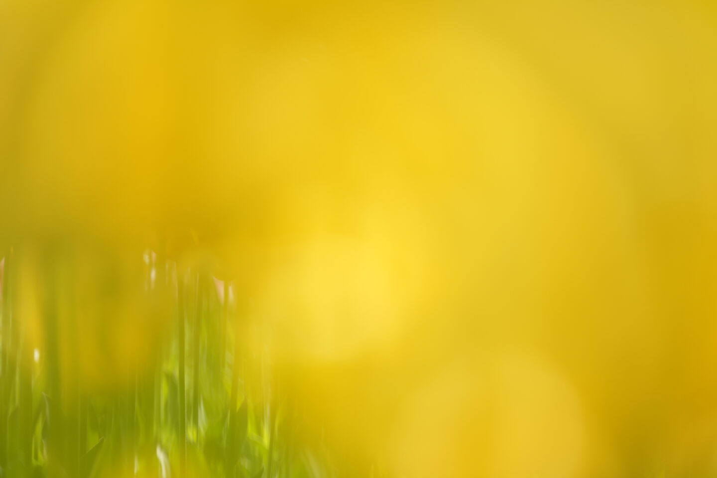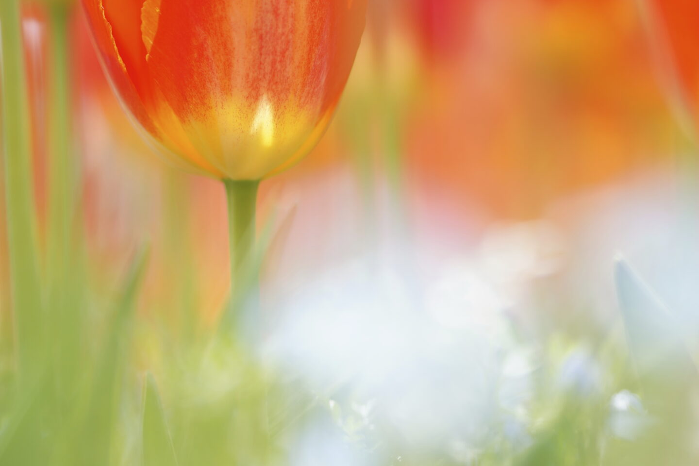 チューリップの花ばかりに目を奪われがちですが、キレイだなと思ったら葉や茎だって立派な被写体になります。これは逆光で輝く黄色いチューリップを前ボケにして奥の茎にピントを合わせています。花に比べて被写体が地味なので茎のグリーンの類似色となる黄色の前ボケだけで構成して画面全体の調和を取り、色の印象が強くでないようにしています。