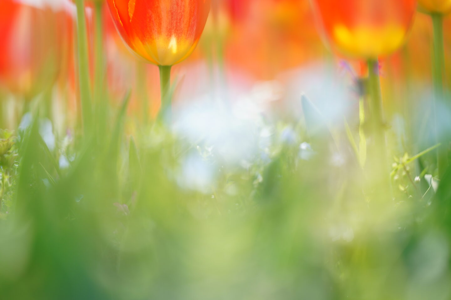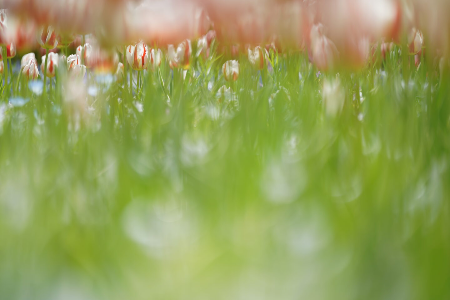 上は手前のチューリップの下から奥のチューリップにピントを合わせていますが、アングルを下げることで前ボケを画面上に持ってくることができます。同じような距離感のチューリップにピントを合わせていても前ボケの位置が変わるだけで大きな変化が生まれます。ちなみに、前ボケのグリーンは芝生、白い丸いボケは芝生に落ちている桜の花びらです。