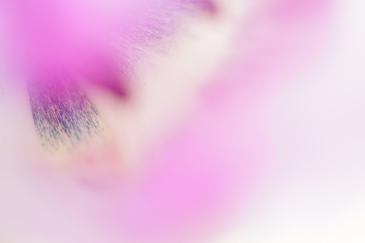 同じく真上からですが、底の花びらの付け根部分の白と紫のグラデーションがとてもキレイだったのでそこにピントを合わせています。実はこの花は枯れ始めていてキレイな花ではありませんが、一部分を切り取れるマクロレンズなら関係ありません。爽やかな印象にするために明るめの露出に設定しています。