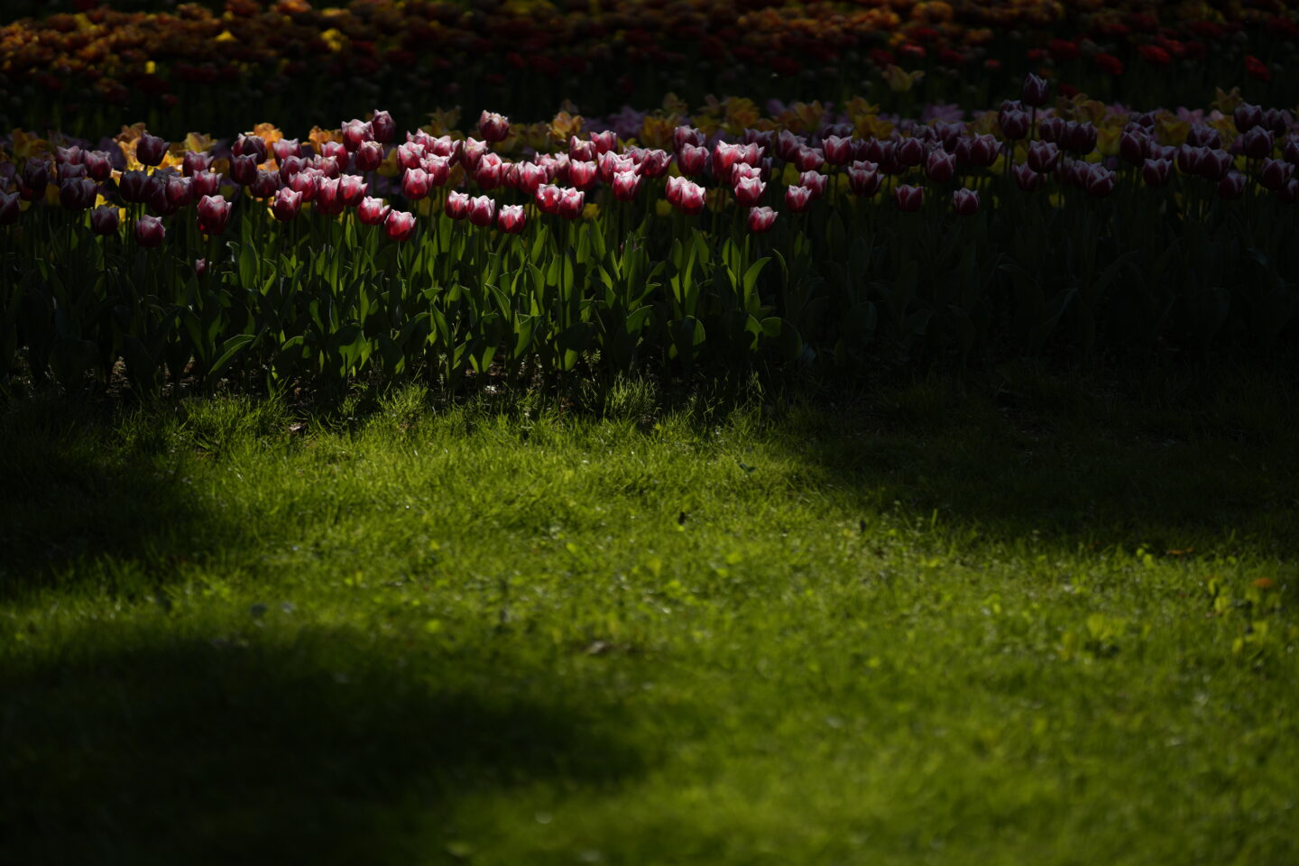 天気の良い日は明暗差が大きくなるので日向と日陰の両方を入れると、どちらかが白飛びしたり黒つぶれしたりしてしまいます。チューリップをキレイに見せたいなら日向か日陰のどちらかで光の当たり方が同じところにレンズを向けるのが一般的ですが、このように日向と日陰が混在するところで極端なアンダー露出にすると、影の部分が黒く潰れて日向の部分だけを浮かび上がらせることができます。黒潰れして構いませんし、ソニーだったらクリエイティブルックをコントラストの高めの仕上がりになるビビッドなどに設定すると、より日向の部分を強調することができます。