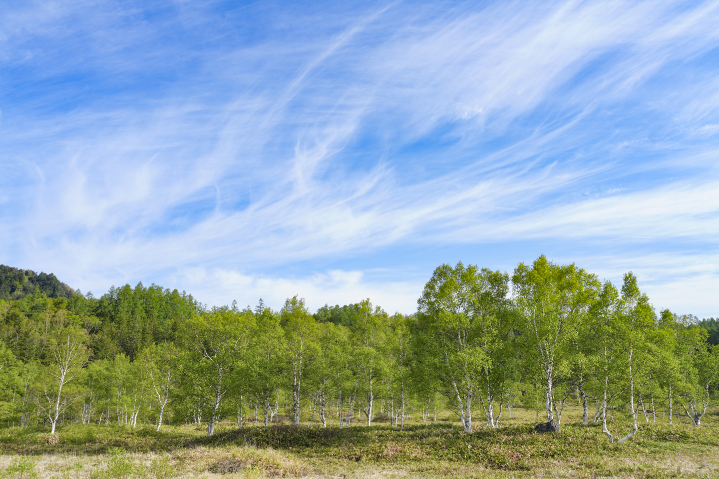 新緑のシラカバが立ち並ぶ高原を撮影していると、青空に美しい巻雲が現れました。シラカバと青空を1:1で配置し、安定感を出して撮影しましたが、その場で感じた清々しい空気感をうまく表現できていません。そこで、より広角域に変更し、青空を大きく入れてみることに。