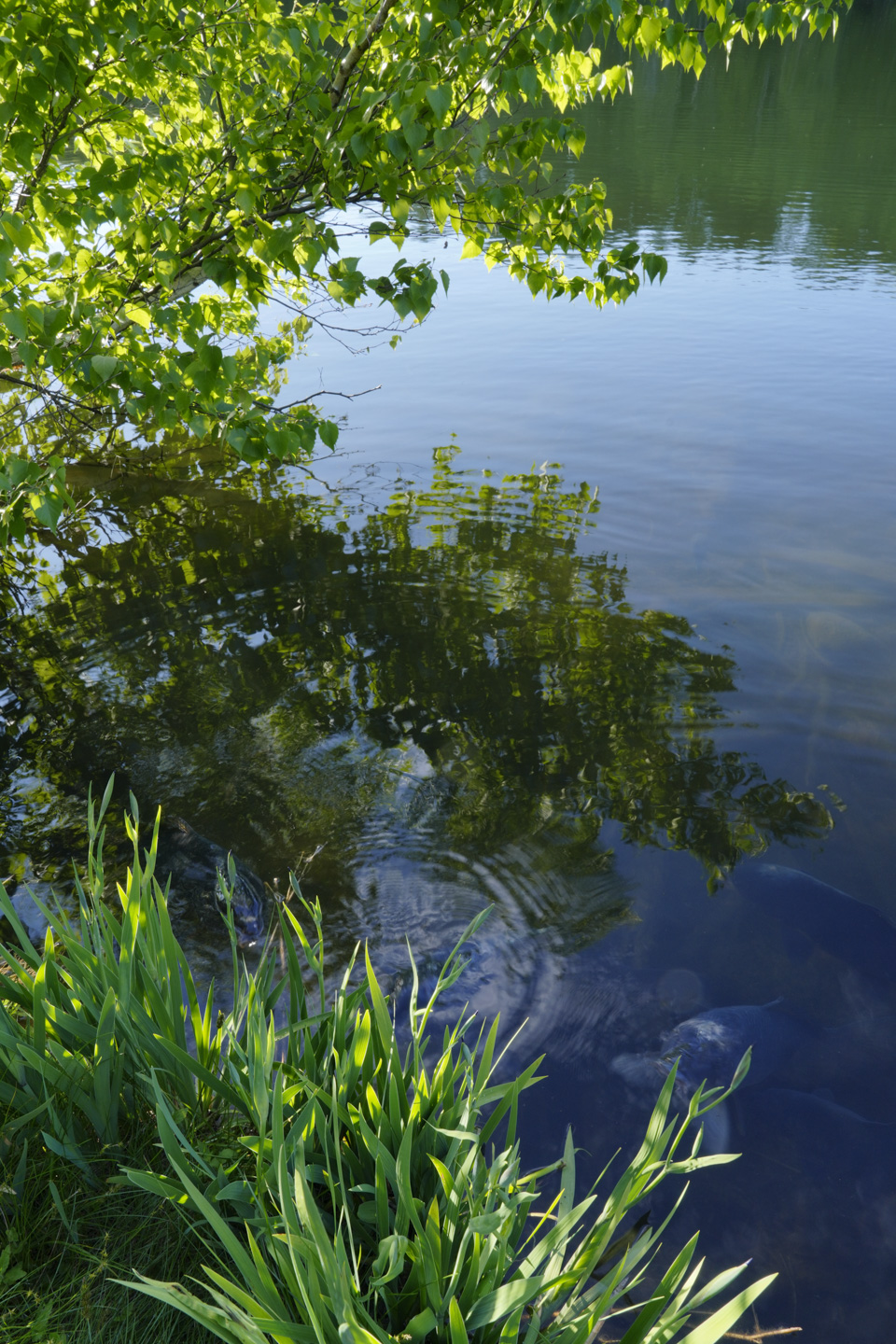 青空が映り込む池と、湖畔の新緑が美しい場所を訪れました。標準レンズを装着し、俯瞰するように構えて撮影。黒々とした針葉樹が並ぶ対岸を入れず、水面と手前の新緑だけで構成して、「青と緑の対比」を引き立てています。逆光気味にカメラを構えて新緑の美しい透過光を捉えていますが、どこかインパクトに欠ける写真になりました。