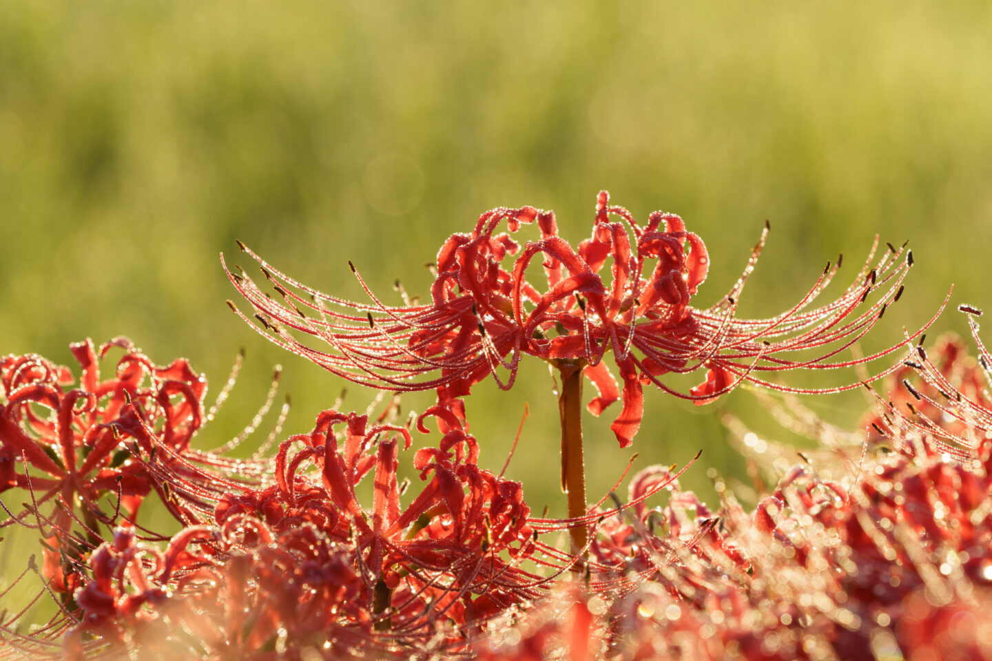 朝露をまとったヒガンバナに日が差しキラキラと輝いていました。広く解釈すれば、花のアップでも風景写真の一部だと言えます。
