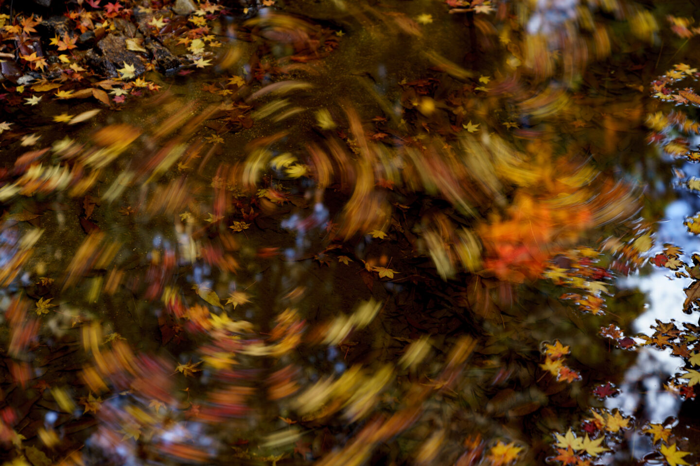 川面でくるくると回る落ち葉。その軌跡を8秒のスローシャッターで描きました。落ち葉の動きの速さに応じてシャッタースピードを決めましょう。
