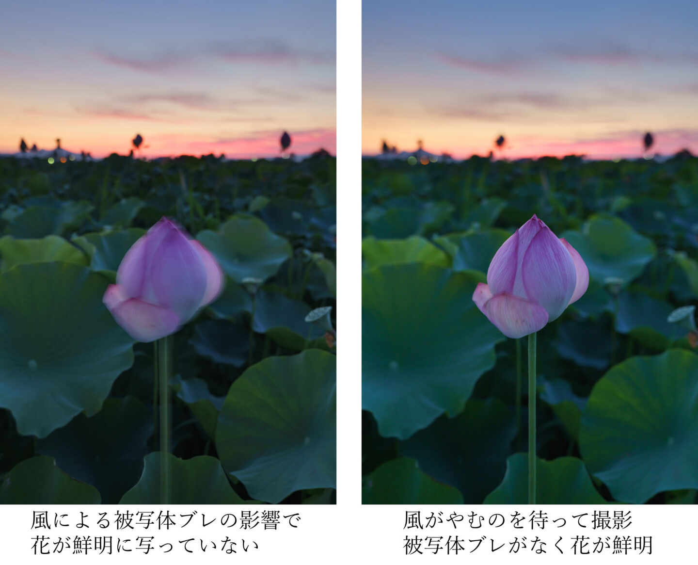 光量が多く明るい状況では速めのシャッターが切れるので少しくらい風が吹いていても被写体ブレの影響はほぼ考えなくても構いません。但し、よほどの強風の場合は、絞りを開け気味にしたり、少しISOを上げたりしてシャッタースピードを調整すると良いでしょう。