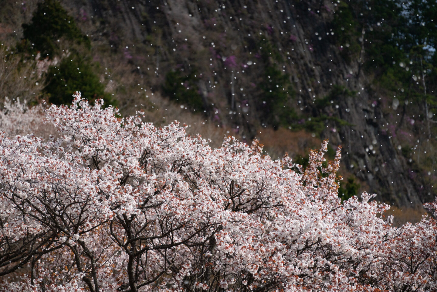 強風に舞い上がる桜吹雪を写し止めました。晴れて明るい状況なら容易に高速シャッターが切れます。