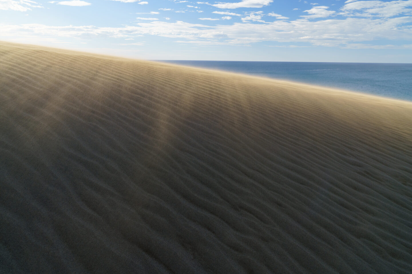 砂丘表面を風で流れる砂を狙いました。強風だったのでやや速めの1/60秒に設定しています。シャッタースピードを速くしすぎると砂が写し止められてしまい、その様子が伝わりにくくなりますし、逆に遅すぎると流れる砂の模様が薄くなってしまいます。こちらも連写モードで撮影しています。