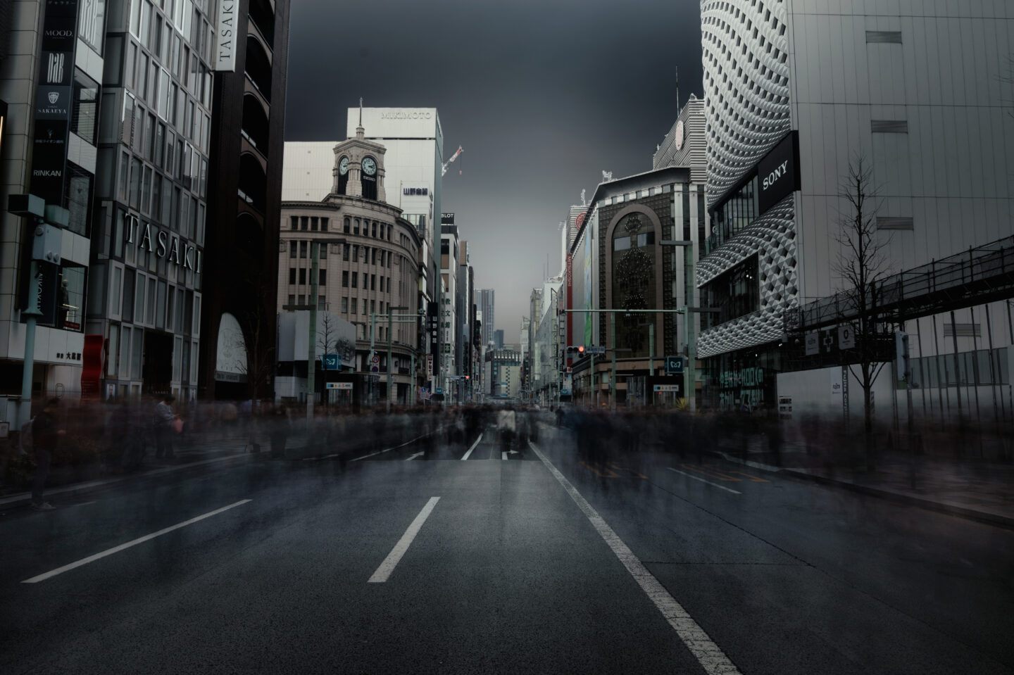 むしろ、建築のトーンだけをわずかに分離させるような色の方向性、たとえば空はわずかにクールに、建築はニュートラルにすることで動かないものと動いたものの対比がより立体的に読めるようになります。