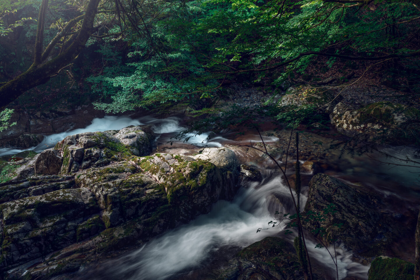 ●70mmでは、望遠レンズで狙ったかのように水流そのものを切り取ることが可能です。 流れる線が画面全体を支配し、 迫力と流麗さを兼ね備えた抽象的な作品に仕上げられます。