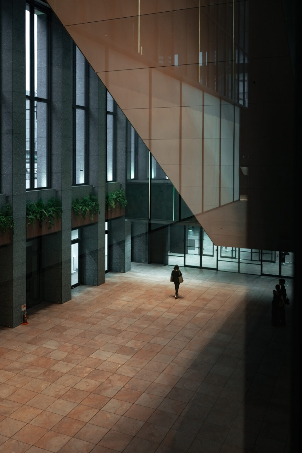 高い天井から差し込む光が床を照らし、 その中央を歩く人物がアクセントとなっています。 広大な空間と人の対比を35mmという自然な画角が絶妙なバランスで切り取ります。