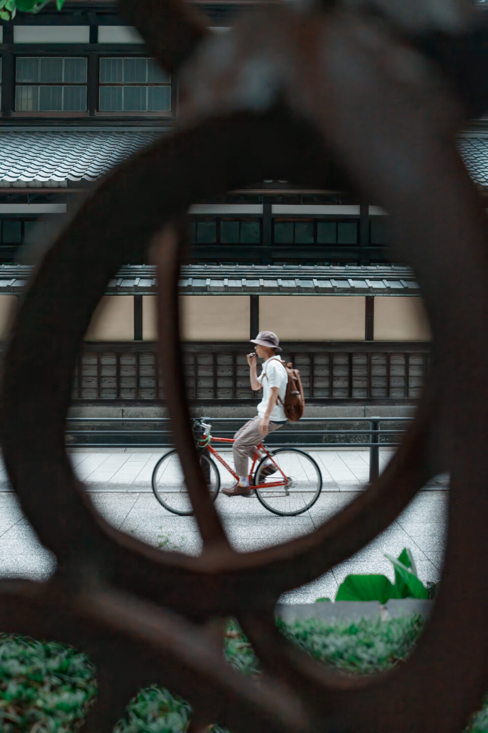 丸い格子越しに自転車で通り過ぎる人の姿がふと現れた一瞬です。 ほんのわずかな出来事がフレームに収まることで、 日常が小さな物語のように感じられます。 手のひらに収まるこのコンパクトさだからこそ、 通りすがりの一瞬にも素早く、 軽い気持ちでシャッターを切ることができます。 街角で生まれる偶然の瞬間を逃さず捉えられるのは、 このカメラならではの魅力です。