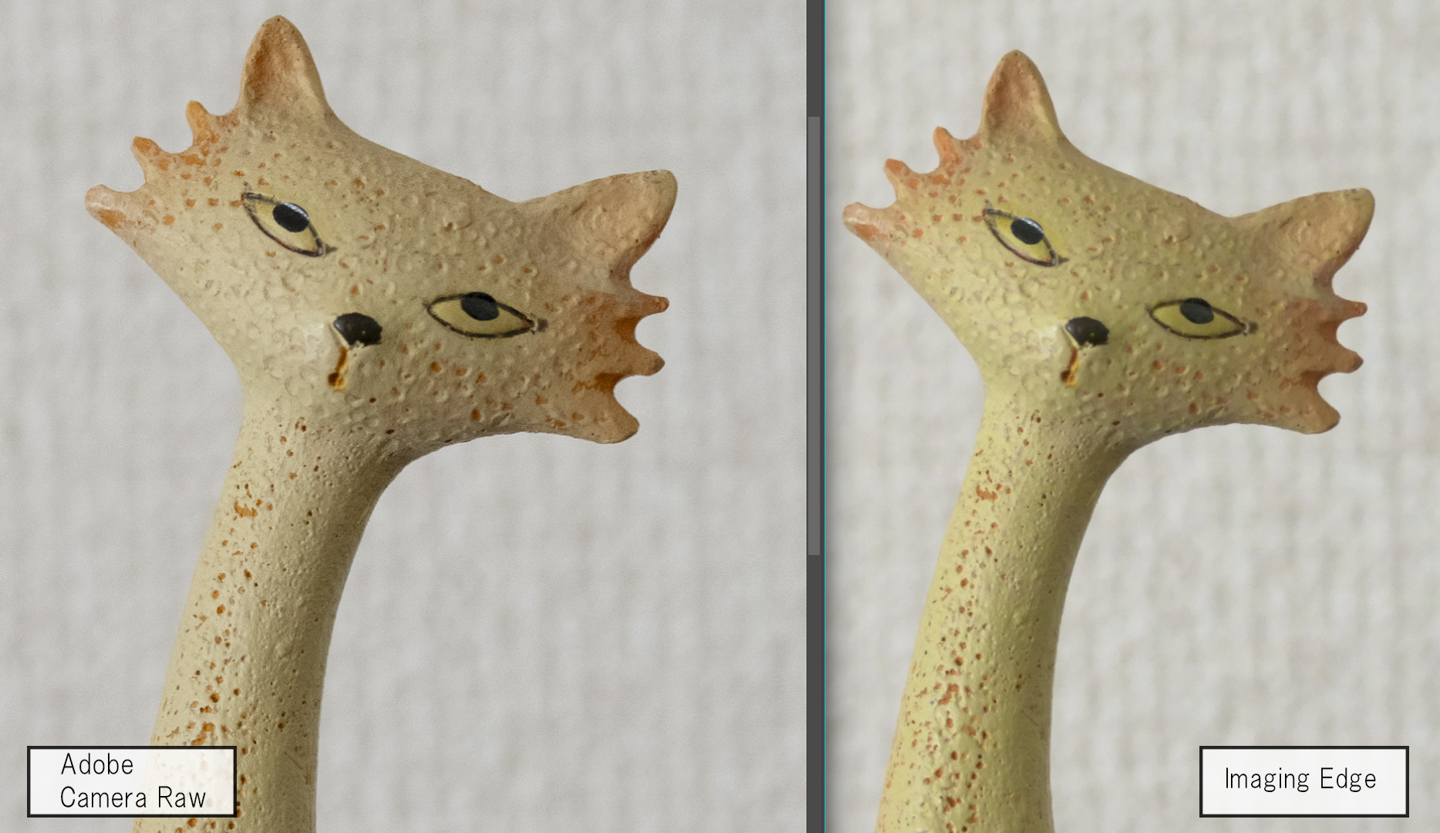 まずは現像ソフトによる差を見るために同じRAWデータをSONY純正のImaging Edge(Windows)とAdobe Camera Rawにて展開。Imaging Edgeは偽色の発生が見られ解像度も今ひとつ。Adobe Camera Rawの方が好結果となった。