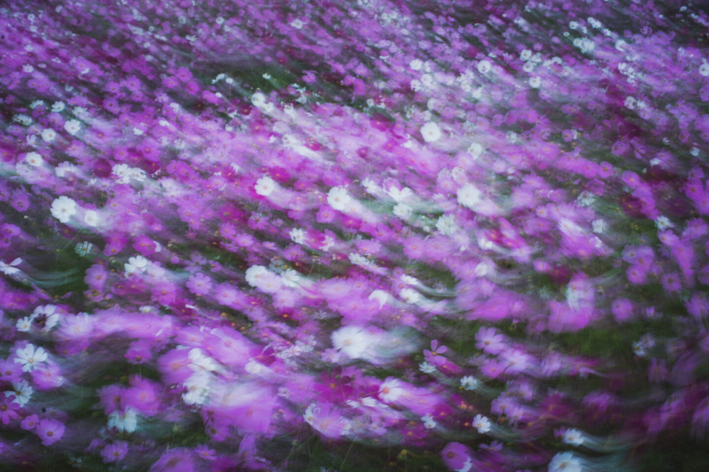 花を望遠で撮るとき、風があると話にならないことが多いが、ここまで強く吹くとこう撮りたくなる。コツは左右に揺れている時、花が左側に振り切った時からシャッターを切ること(右でもよい)。中途半端な位置からシャッターを切ると花の原型がわからなくなる。あと、密集度を高めるためにカメラは高めの位置から撮影してみた。